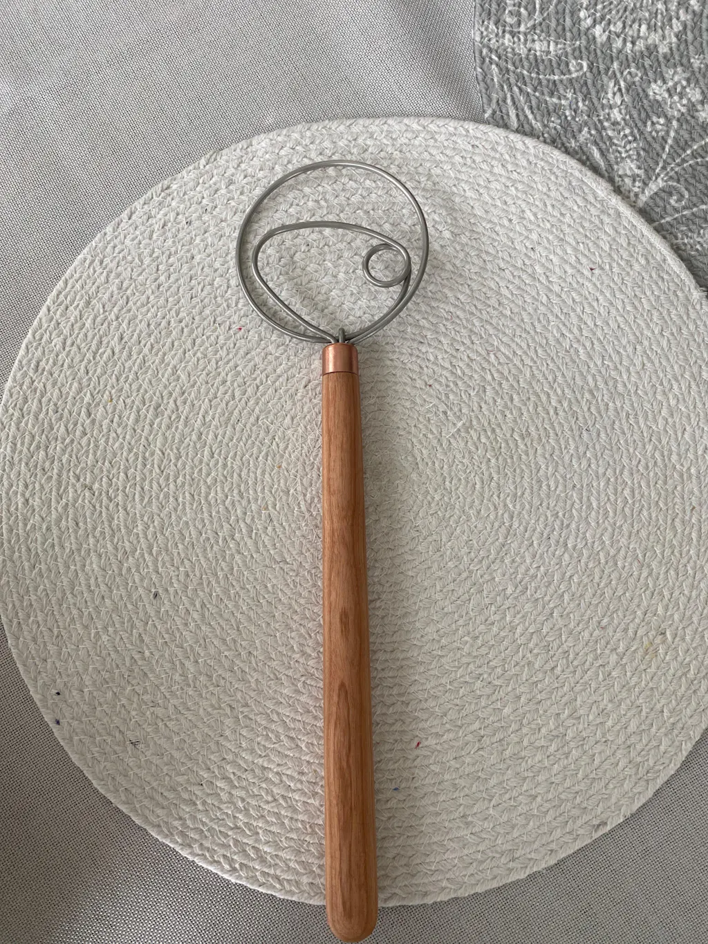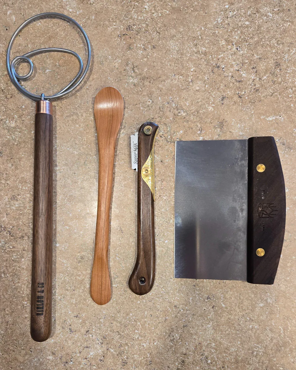 The handle is very comfortable and beautifully crafted from American hardwoods (Walnut, Maple, and Cherry).  We use a copper ferrule and heavy gauge stainless steel wire, making our dough hook incredibly durable.  These are handmade in the USA by the craftsman of Barlow & Co.